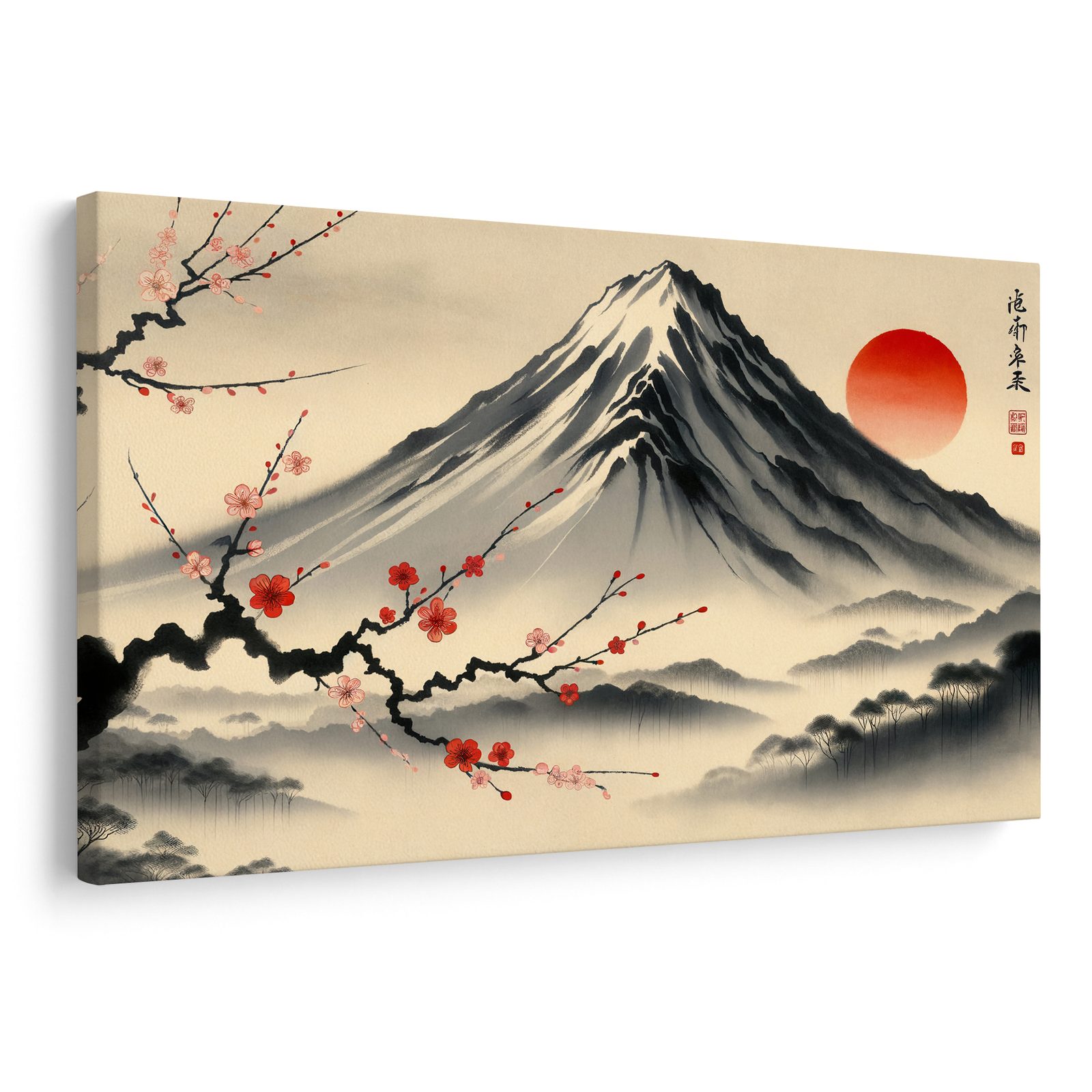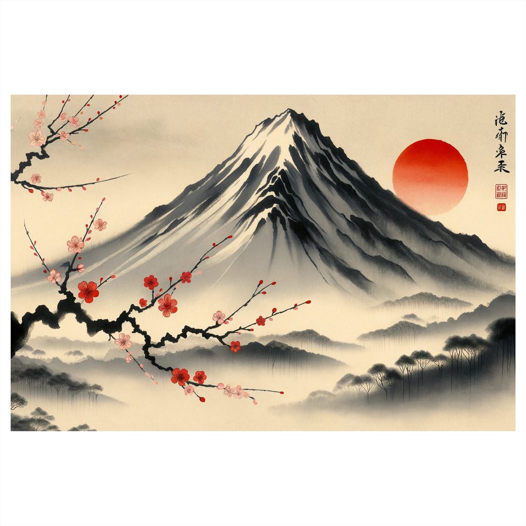 Slika japanske krajine prikazuje veličanstvenu planinu s crvenim suncem u pozadini. U prvom planu se proteže elegantna grana s cvjetovima trešnje, koja unosi u sliku nježnost i prirodnu ljepotu. Dominiraju ovdje suzdržane boje sive, crne i crvene, koje stvaraju mirnu i harmonijsku atmosferu. Ova slika savršeno se uklapa u dnevni boravak ili radnu sobu, gdje dodaje na eleganciji i kulturnom šarmu. Kvalitetna izrada jamči dugotrajnost i postojanost boja.