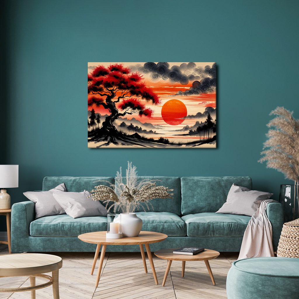 Slika koja prikazuje motiv stabla života pri zalasku sunca stvara jedinstvenu atmosferu mira i harmonije. Dominantne crvene i narančaste nijanse sunca kontrastiraju s tamnim siluetama stabla i krajolika, što djelu daje dubinu i dinamiku. Ukupni dojam je impresivno emotivan, evocirajući osjećaj opuštenosti i ljepote prirode. Ova slika savršeno će se uklopiti u dnevni boravak ili radnu sobu, gdje će donijeti pozitivnu energiju. Visokokvalitetni tisak jamči dugovječnost i žive boje koje će oživjeti svaki interijer.