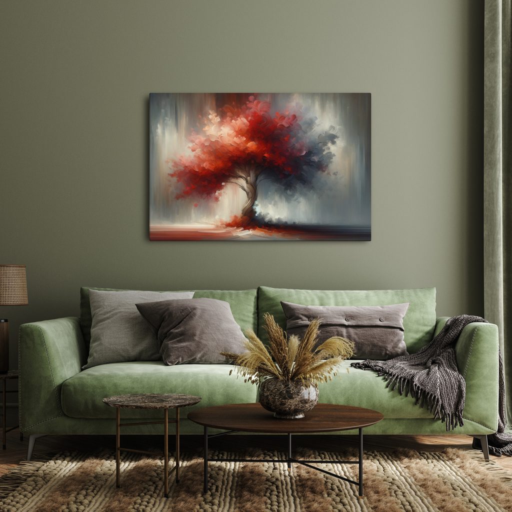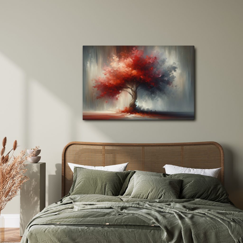 Slika mističnog stabla života donosi jedinstvenu atmosferu u vašem interijeru. Glavni element je veličanstveno stablo s bogatim lišćem u toplim nijansama crvene i narančaste, koje se uzdiže iznad suptilnih, sivih pozadina. Kombinacija boja stvara harmoničan kontrast koji evocira mir i snagu prirode. Ova slika je idealan odabir za oživljavanje dnevnog boravka ili radne sobe i dodaje prostoru osobit šarm. Kvalitetni tisak na platnu jamči dugotrajnost i izražajne detalje koji će vas veseliti dugi niz godina.