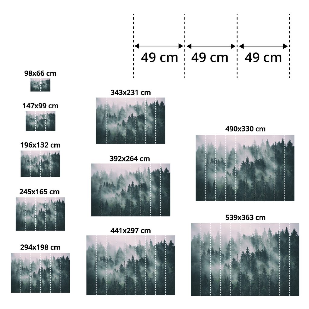Kod tapeta visine 270 cm motiv se prilagođava odgovarajućoj veličini, pri čemu se većinom smanjuje. Klikom na dimenziju na web stranici prikazat će se točan izgled tapete. Veličine se sastoje od traka širine 49 cm.
